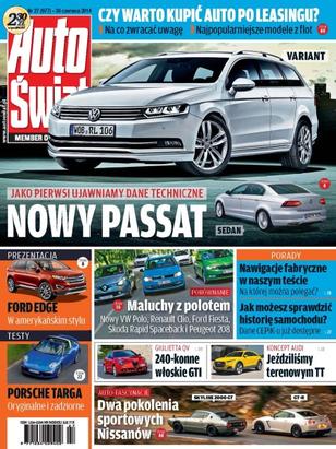 VW Passat – w tym tygodniu zadebiutuje 8. generacja Passata; Ford Edge – duży amerykański SUV także dla Europejczyków; Alfy Romeo: Giulietta QV i MiTo QV – pierwsza jazda sportowymi wersjami; Audi TT Offroad Concept – SUV w rodzinie TT; Porsche 911 Targa 4S – pierwszy test nowej Targi; Mitsubishi Outlander PHEV – SUV z zaawansowanym systemem hybrydowym; baza danych CEPiK-u – informacje dostępne dla każdego; Lexus CT 200h – hybrydowy kompakt w teście na dystansie 100 tys. km.