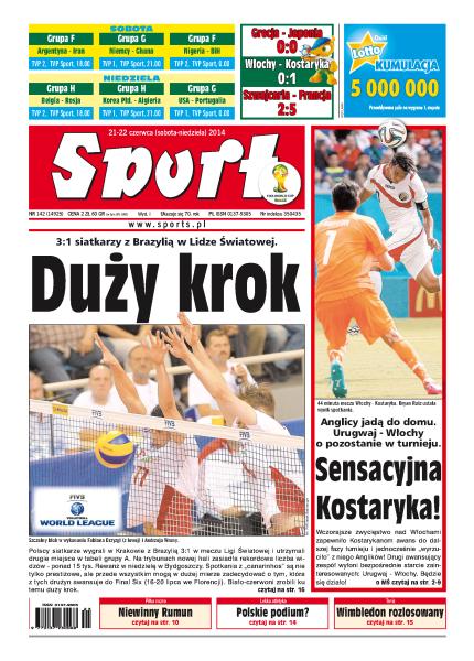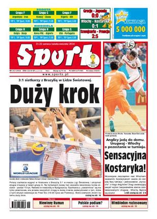 3:1 siatkarzy z Brazylią w Lidze Światowej; mundial: Anglicy jadą do domu, spotkanie Urugwaj-Włochy o pozostanie w turnieju, Francja gromi Szwajcarię; Niemcy zagrają dziś 101. mecz w finałach mistrzostw świata; Wimbledon rozlosowany; kolarski wyścig Dookoła Szwajcarii wkracza w najtrudniejszą fazę; Polacy mają szanse na podium w 5. drużynowych mistrzostwach Europy w lekkoatletyce.