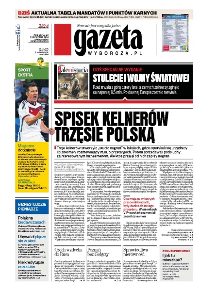 Spisek kelnerów trzęsie Polską – troje kelnerów stworzyło „studio nagrań” w lokalach, gdzie spotykali się urzędnicy i biznesmeni rozmawiający m.in. o przetargach – potem sprzedawali podsłuchy zainteresowanym biznesmenom, ale ktoś przejął od nich zapisy nagrań; Czech wzdycha do Rusa – Czesi są załamani, bo Rosjanie przestali do nich przyjeżdżać i wydawać góry pieniędzy; Poznań bez Golgoty – burza po odwołaniu spektaklu „Golgota Picnic” na festiwalu Malta; Polak na biedawczasach – większość Polaków nigdzie nie wyjeżdża na urlop, nie stać nas, gospodarka na tym traci; obywatel plącze się w sieci – za rok urząd skarbowy sam będzie wypełniał PIT-y, kupujący używane auto z domu sprawdzi jego historię – obiecuje nam minister administracji i cyfryzacji.