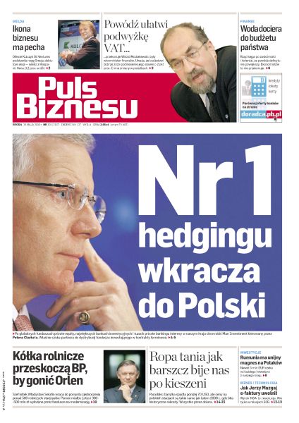 Jeden z największych w Europie zakładów kolektorów słonecznych ruszy jesienią; były wiceminister finansów namawia rząd do niepopularnych decyzji podatkowych; AHL, największy na świecie fundusz inwestujący w kontrakty, chce podbić serca polskich inwestorów; rząd deklaruje, że powódź nie będzie miała wpływu na deficyt – ekonomiści są innego zdania; na każdego inwestora z Polski czeka nawet 5 mln EUR z Brukseli; powódź nie oszczędziła polskich dróg, budowa wielu opóźni się; szefowie rolniczych stacji paliw dochodzą do jedynego słusznego wniosku: w jedności siła; e-podpis i EDI nie są konieczne do przesyłania faktur drogą elektroniczną; przegrupowania w portfelach inwestorów najmocniej trzęsą rynkami surowcowymi.