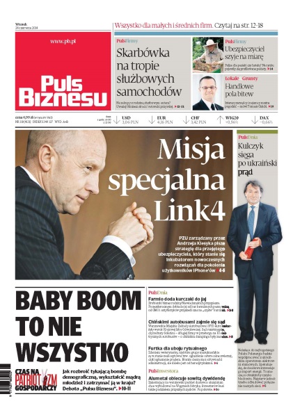 Misja specjalna Link4 – PZU zarządzany przez Andrzeja Klesyka pisze strategię dla przejętego ubezpieczyciela, który stanie się inkubatorem nowoczesnych rozwiązań dla pokolenia użytkowników iPhone’ów; Baby Boom to nie wszystko – debata „Pulsu Biznesu” o tym jak rozbroić tykającą bombę demograficzną, wykształcić mądrą młodzież i zatrzymać ją w kraju; Farmio doda kurczaki do jaj – drobiarski biznes rodziny Niewiadomskich przyspiesza, po zeszłorocznym debiucie jaj od kur karmionych paszą wolną od GMO i antybiotyków przyszedł czas na „czyste” kurczaki; Kulczyk sięga po ukraiński prąd – należąca do najbogatszego Polaka Polenergia będzie współpracować z ukraińskim operatorem elektrowni atomowych; furtka dla uboju rytualnego – zdaniem weterynarzy, niektóre grupy muzułmańskie są w stanie zaakceptować tzw. ogłuszanie odwracalne zwierząt, czyli ogłuszanie prądem.