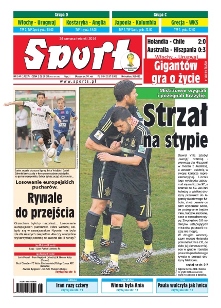 Strzał na stypie – mistrzowie wygrali i pożegnali Brazylię – Dawid Villa zdobył „swoją” bramkę, pierwszą dla Hiszpanii w meczu z Australią, a zarazem ostatnią w swojej karierze reprezentacyjnej; rywale do przejścia – losowanie europejskich pucharów nie było złe dla polskich zespołów; droga przez Iran – porażka z Brazylią to dla nas zimny prysznic, ale cały czas jesteśmy w grze o turniej finałowy Ligi Światowej; chwała pokonanej – Paula Kania nie przestraszyła się ani Na Li, ani atmosfery kortu centralnego; na etapie budowania – „Zaproszenie do gry w Tauron Basket Lidze to dla naszego klubu przełomowy moment, mam nadzieję, że na dłużej zagościmy w elicie” – Wojciech Wieczorek, trener MKS-u Dąbrowa Górnicza.