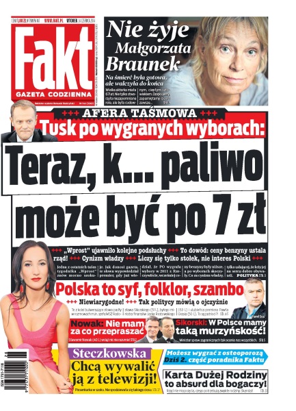 „Teraz, k... paliwo może być po 7zł” – Donald Tusk po wygranych wyborach; „Wprost” ujawniło kolejne podsłuchy – jedna z ostatnich taśm tygodnika znów mocno szokuje; Polska to syf, folklor, szambo – tak politycy mówią o ojczyźnie; karta Dużej Rodziny to absurd dla bogaczy – rząd nie ma pojęcia, czego potrzebują zwykłe rodziny; chcą wywalić ją z telewizji – Justyna Steczkowska w szoku, nie spodziewała się takiego ciosu; nie żyje Małgorzata Braunek – na śmierć była gotowa, ale walczyła do końca; Sting wydziedziczy dzieci – jeden z najsłynniejszych kompozytorów i piosenkarzy, legenda rocka – Sting - to chyba facet kompletnie bezduszny – zapowiedział, że w testamencie nie zostawi swym dzieciom ani grosza.
