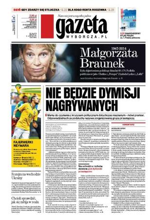 Nie będzie dymisji nagrywanych – Mamy do czynienia z kryzysem politycznym dotychczas nieznanym – mówi premier –odpowiedzialnych za podsłuchy nazywa zorganizowaną grupą przestępczą; nie żyje Małgorzata Braunek – była objawieniem polskiego kina lat 60. i 70. – podbiła publiczność jako Oleńka z „Potopu” i Izabela Łęcka z „Lalki”; rozejm na wschodzie Ukrainy – separatyści też przerywają ogień do 27 czerwca – zapowiedział wieczorem Aleksandr Borodaj, samozwańczy premier Donieckiej Republiki Ludowej; chcieli sprawdzić, jak się zabija w realu – Paweł i Karolina, licealista i gimnazjalistka, poznali się w internecie – zabijali w grach komputerowych, w końcu zaatakowali sąsiadkę dziewczyny; fajerwerki Neymara – Brazylijczyk zdobył dwie bramki w meczu z Kamerunem i z czterema golami jest liderem strzelców.