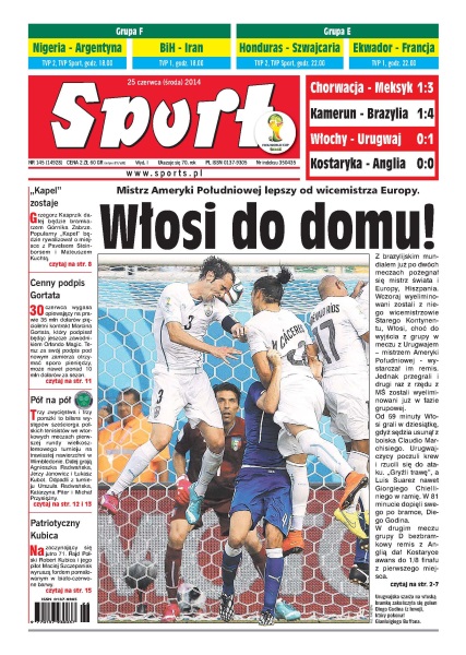 Włosi do domu – mistrz Ameryki Południowej lepszy od wicemistrza Europy; „Kapel” zostaje – Grzegorz Kasprzik dalej będzie bramkarzem Górnika Zabrze, popularny „Kapel” będzie rywalizował o miejsce z Pavelsem Steinborsem i Mateuszem Kuchtą; cenny podpis Gortata – 30 czerwca wygasa opiewający na prawie 35 milionów dolarów pięcioletni kontrakt Marcina Gortata, który podpisał będąc jeszcze zawodnikiem Orlando Magic, teraz za swój podpis pod nowym zamierza otrzymać sporo pieniędzy, może nawet ponad 10 milionów dolarów za sezon; pół na pół – trzy zwycięstwa i trzy porażki to bilans występów sześciorga polskich tenisistów we wtorkowych meczach pierwszej rundy wielkoszlemowego turnieju na trawiastej nawierzchni w Wimbledonie; patriotyczny Kubica – na zaczynający się jutro 71. Rajd Polski Robert Kubica i jego pilot Maciej Szczepaniak wyruszą fordem pomalowanym w biało-czerwone barwy.