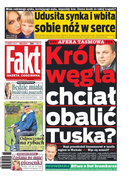 Król węgla chciał obalić Tuska – rząd przeszkodził biznesmenowi w handlu węglem ze Wschodu więc się zemścił; Małgorzata Braunek będzie miała buddyjski pogrzeb – na pogrzebie zmarłej przedwczoraj aktorki nie będzie księdza, jej ciało zostało skremowane; odpoczynek na rybach – Olaf Lubaszenko postanowił odpocząć z wędką w dłoni; „Zostaną po mnie piosenki” – Irena Santor dla Faktu; bitwa o but bramkarza – bramkarz fatalnie grającej Hiszpanii Iker Casillas rzucił w trybuny swoim... butem, a kibice zaczęli się o niego bić; udusiła synka i wbiła sobie nóż w serce – miała cudownego synka, kochającego męża, wspaniały dom, czemu doszło do takiej tragedii; Anna Korcz wyniosła się od drugiego męża – poważny kryzys w związku aktorki, wyprowadziła się z domu na wsi i ani myśli tam wracać.