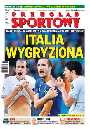 Italia wygryziona – Suarez znów kąsa, Godin strzela, Włosi odpadają, Prandelli rezygnuje; rezerwowi rządzą w mundialu – na półmetku brazylijskich mistrzostw rezerwowi strzelili już o jednego gola więcej niż w całym mundialu w RPA; kuszenie Celebana – gdańszczanie rozmawiają z byłym reprezentacyjnym obrońcą już od wiosny, ale on wolałby grać za granicą; trzy razy wesele, trzy razy pogrzeb – Bezbłędna Agnieszka Radwańska, Kubot serwujący jak z armaty, Janowicz zwalczający słabości – to największe plusy drugiego dnia; wyścig dwóch gwiazd – dzisiaj w Sobótce początek mistrzostw Polski, pierwsze złoto powinien zdobyć ktoś z dwójki Maciej Bodnar, Michał Kwiatkowski.