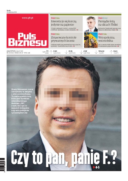 Czy to pan, panie F.? – znany biznesmen został zatrzymany w związku z aferą podsłuchową, to uwiarygadnia tezę, która jest wynikiem dziennikarskiego śledztwa „PB”, o tym, kto i po co wypuścił nielegalne nagrania polityków i przedsiębiorców; inwestycje się kurczą jedynie na papierze – z Polski odpłynęło 6 mld zł — podają NBP i UNCTAD, spokojnie, to tylko statystyka; zmasowane kontrole prywatnych lecznic – publiczny szpital jest prześwietlany raz na pięć lat, prywatny — nawet kilka razy w roku; pieniądze leżą na ulicach Tbilisi – ambasador Cieszkowski zaprasza nasz biznes do odkrywania Gruzji; wsi spokojna, wsi mobilna – już co czwarty rolnik używa smartfonu do zarządzania gospodarstwem.