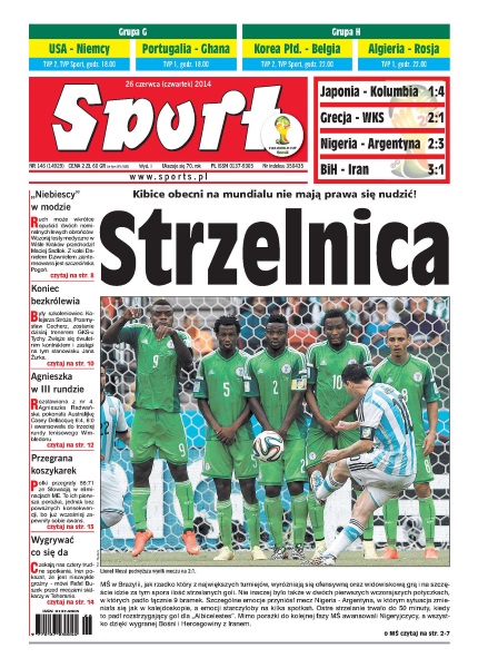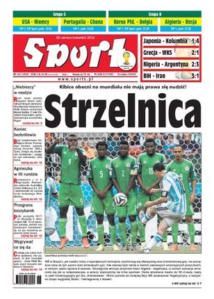 Strzelnica – kibice obecni na mundialu nie mają prawa się nudzić – szczególne emocje przyniósł mecz Nigeria - Argentyna, w którym sytuacja zmieniała się jak w kalejdoskopie, a emocji starczyłoby na kilka spotkań; „Niebiescy” w modzie – Ruch może wkrótce opuścić dwóch nominalnych lewych obrońców; koniec bezkrólewia – były szkoleniowiec Kolejarza Stróżę, Przemysław Cecherz, zostanie dzisiaj trenerem GKS-u Tychy; Agnieszka w III rundzie – rozstawiona z numerem 4. Agnieszka Radwańska pokonała Australijkę Casey Dellacquę i awansowała do trzeciej rundy tenisowego Wimbledonu; przegrana koszykarek – Polki przegrały ze Słowacją w eliminacjach ME – to ich pierwsza porażka, jednak bez poważnych konsekwencji, bo już wcześniej zapewniły sobie awans.