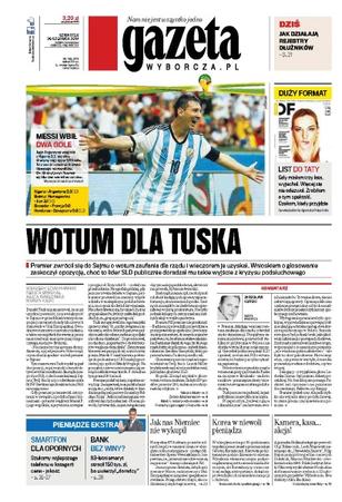 Wotum dla Tuska – premier zwrócił się do Sejmu o wotum zaufania dla rządu i wieczorem je uzyskał, wnioskiem o głosowanie zaskoczył opozycję, choć to lider SLD publicznie doradzał mu takie wyjście z kryzysu podsłuchowego; Messi wbił dwa gole – jego Argentyna wygrała z Nigerią 3:2, ale obie drużyny zagrają w 1/8 finału; list do taty – „Gdy miałam trzy lata, wyjechał. Więcej się nie odezwał. Zrobiłam o tym spektakl. Czekam, kiedy przyjdzie” – Agnieszka Przepiórska; jak nas Niemiec nie wykupił – niespełna 573 hektary gruntów rolnych kupili w naszym kraju w ubiegłym roku cudzoziemcy – podaje Ministerstwo Spraw Wewnętrznych; Korea w niewoli pieniądza – w ubiegłym roku po 80-godzinnym tygodniu pracy zmarł z przemęczenia 34-letni Koreańczyk, harówka po kilkanaście godzin dziennie to norma.