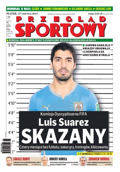 Luis Suarez skazany – cztery miesiące bez futbolu: zakaz gry, treningów, kibicowania – surowa kara dla gwiazdy Urugwaju i Liverpoolu za ugryzienie rywala; Łukasz Kubot – lubinianin w III rundzie Wimbledonu, mecz Janowicza przerwany; Robert Kubica – dachowanie pozbawiło go szans na czołowe miejsce w Rajdzie Polski; Zbigniew Bródka – latem największą owację dostał na festiwalu w Opolu; Niemcy nikogo nie oszwabili – gol Thomasa Muellera dał Niemcom zwycięstwo, ale Amerykanów nie wyeliminował z mistrzostw świata; Iran prawdę powie – o awans do Final Six Polacy walczą z objawieniem tegorocznych rozgrywek, potrzebują siedmiu punktów.