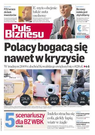 Sytuacja finansowa Polaków w 2009 r. poprawiła się – pogłębiają się natomiast problemy mieszkaniowe; kto często chce jeździć autostradami, będzie mógł wybrać e-myto, zamiast płacić na bramce; pierwszy niepubliczny park technologiczny zbuduje laboratoria i łoży na badania; na NewConnect pojawiają się głosy, że segment NC Lead jest zbyt elitarny; elektroniczne WZA Netii okazało się sukcesem – operator może podzielić się swoim rozwiązaniem z innymi spółkami; skoro Zachód renacjonalizuje banki, dlaczego nie mielibyśmy zrepolonizować BZ WBK – idea ta ma spore poparcie; pod względem oddziaływania na środowisko kolej przewyższa transport drogowy; globalni gracze mają już dość spadków, a temat europejskich długów jest już zgrany.