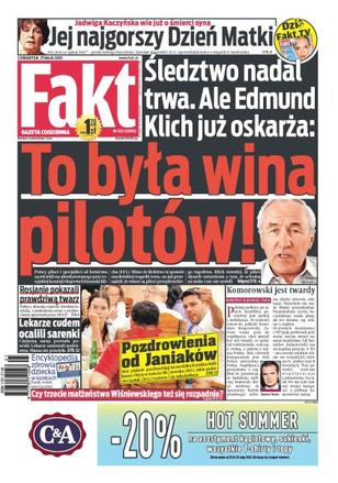 Śledztwo w sprawie katastrofy prezydenckiego tupolewa w Smoleńsku trwa, ale polski obserwator Edmund Klich już wie, kto jest winny; zdaniem rosyjskich prokuratorów morderstwa na Polakach to przekroczenie uprawnień NKWD; to bandyta powinien bać się funkcjonariusza, a nie funkcjonariusz bandyty; Jadwiga Kaczyńska dopytuje się o szczegóły katastrofy tupolewa; UOKiK nałożył karę na firmy Tikkurila i Praktiker za niedopuszczalne ustalanie cen; Karolina i Olivier Janiak to wyjątkowo zgrane małżeństwo; działacze GKS przedstawili Dawidowi Nowakowi ofertę równie atrakcyjną, jak ta z warszawskiej Polonii; Franciszek Smuda spodziewa się ostrej walki, ale jest w świetnym humorze.