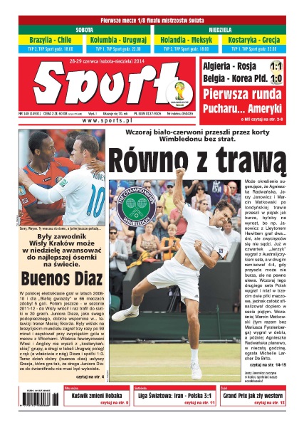 Równo z trawą – wczoraj biało-czerwoni przeszli przez korty Wimbledonu bez strat; Buenos Diaz – były zawodnik Wisły Kraków może w niedzielę awansować do najlepszej ósemki na świecie; giermkowie księcia – Neymar i Alexis Sanchez są liderami swoich reprezentacji, w Barcelonie jednak mają tylko status pomocników Lionela Messiego; lanie w Teheranie – biało-czerwoni mecz z Iranem rozpoczęli od wygranego seta, a później nie mieli już nic do powiedzenia; arabski sen na jawie – tłumy na ulicach, fajerwerki, klaksony, specjalne wydania gazet – Algieria z impetem świętuje pierwszy w dziejach awans do fazy pucharowej mistrzostw świata.