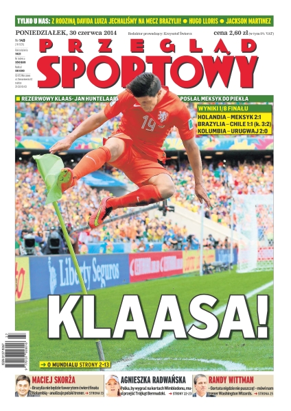 Drużyna Jose Pekermana robi furorę w brazylijskim turnieju; zespół Louisa van Gaala już kładł głowę pod toporem, ale dwa gole w samej końcówce rozpostarły mu drzwi nawet do medalu; RFN ma z drużyną z Afryki najgorszy bilans ze wszystkich swoich rywali w historii; podczas mundialu dużo mówi się o fawelach, siedlisku biedy i występku; by wygrać turniej, Agnieszka Radwańska musi pokonać trzy leworęczne rywalki; Polacy po raz drugi przegrali z Iranem i są w tarapatach.