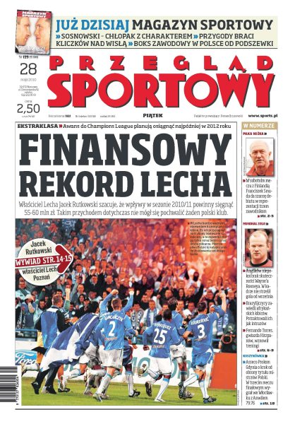 Właściciel Lecha, Jacek Rutkowski, szacuje, że wpływy w sezonie 2010/11 powinny sięgnąć 55-60 mln zł – takim przychodem dotychczas nie mógł się pochwalić żaden polski klub; Franciszek Smuda jest blisko ułożenia wyjściowego składu na Finlandię; wywiad z Dariuszem Dudką, reprezentantem polski; Wayne Rooney zatracił skuteczność – w kadrze nie zdobył bramki od września; na czyich barkach selekcjoner Holandii Bert van Marwijk opiera grę reprezentacji; niedoceniany francuski piłkarz zadebiutował i od razu strzelił zwycięskiego gola w spotkaniu z Kostaryką; Fiodor Łapin doprowadził do tytułu mistrza świata Krzysztofa Włodarczyka – jutro stanie w narożniku Alberta Sosnowskiego.
