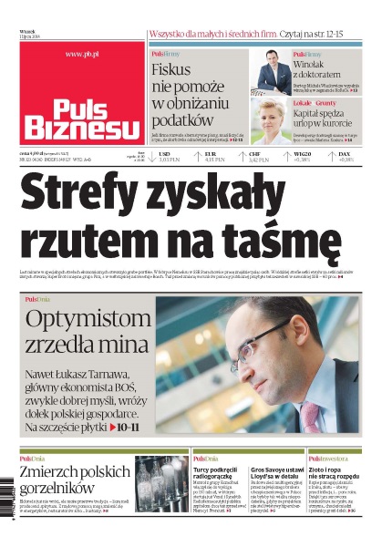 Start-up Michała Więckowicza wypełnia winną lukę w segmencie HoReCa; deweloperzy dostrzegli szansę w turystyce — uważa Marlena Kosiura; jeśli firma rozważa alternatywne plany, musi liczyć się z tym, że skarbówka odmówi jej interpretacji; last minute w specjalnych strefach ekonomicznych otworzyło grube portfele; nawet Łukasz Tarnawa, główny ekonomista BOŚ, zwykle dobrej myśli, wróży dołek polskiej gospodarce - na szczęście płytki; eldorado już nie wróci, ale może przetrwa tradycja — liczą mali producenci spirytusu; Monrol z grupy Eczacibasi włączył się do wyścigu po 150 mln zł, w którym startują już Voxel i Synektik; Gros Savoye ustawi Lloyd’sa w detalu; złoto i ropa nie stracą rozpędu.