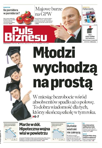 Zaledwie w ciągu miesiąca bezrobocie wśród absolwentów spadło aż o połowę; PGE ma zdecydowaną przewagę w starciu o Energę; Komisja Europejska chce poznać opinie o jednej z form inwestycji publicznych i prywatnych; marże spadają poniżej 2 procent, banki mają nadzieję, że to tylko promocja; producent turbin do wiatraków dostał 3,3 mln zł, teraz musi oddać 6 mln; pomidorowa wojna Łowicza z Pudliszkami obnażyła pułapki marketingu.