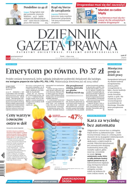 Czy kierowca musi się stosować do źle ustawionych znaków drogowych; Pendolino za 49 zł – pociąg będzie miał pięć poziomów cenowych; państwowe koncerny mają wspólnie finansować gospodarkę – tak każą ministerialni urzędnicy; europosłowie kończącej się właśnie kadencji europarlamentu dostaną pełne wynagrodzenie za lipiec, chociaż kadencja w tym miesiącu trwała formalnie raptem 10 godzin; projekt zmiany konstytucji, który zakłada jednakowe podwyżki świadczeń dla każdego, ma wstępne poparcie nie tylko PO, PSL i PiS; już dziś w hurcie za niektóre warzywa trzeba zapłacić o połowę mniej niż przed rokiem – a będzie jeszcze taniej, bo zapowiadają się dobre zbiory; obligatoryjne i sztywne kary za nielegalne ścięcie drzewa są niekonstytucyjne – orzekł wczoraj trybunał.
