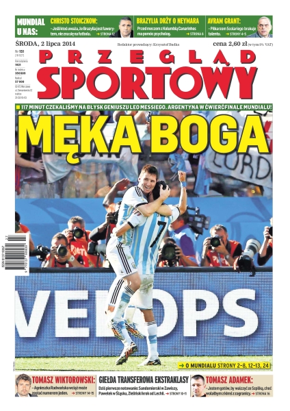 Dopiero 27. strzał zapewnił drużynie Sabelli awans; Manuel Neuer to bramkarz, który udowodnił, że mógłby grać jako zawodnik z pola; przed ćwierćfinałem z Kolumbią Luiz Felipe Scolari sprowadza psycholog, z którą pracuje od kilkunastu lat – ma pomóc Neymarowi i jego kolegom; Agnieszka Radwańska przegrała z Jekateriną Makarową 3:6, 0:6 – we wcześniejszych meczach straciła raptem dziewięć gemów; walka Tomasz Adamek – Artur Szpilka może się odbyć 8 listopada w Krakowie, ale do finalizacji rozmów jeszcze daleko; nowy kontrakt Marcina Gortata będzie wynosił 50 milionów dolarów, ale brutto; szóste miejsce w mistrzostwach Europy i awans do mistrzostw świata pozwalają na wystawienie Polakom wysokiej oceny za sezon 2013/14; czołowa polska pingpongistka wystąpi w Lidze Mistrzów; czy Joanna Jędrzejczyk może być pierwszą polską mistrzynią organizacji UFC