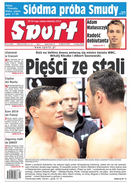 Siódma próba Smudy: dziś w meczu z Finlandią zadebiutują nowi piłkarze; w Niemczech mistrz świata WBC, Witalij Kliczko, zmierzy się z Albertem Sosnowskim; UEFA zdecydowała: Francja będzie organizatorem piłkarskich mistrzostw Europy w 2016 roku; ZAKSA Kędzierzyn Koźle montuje niesłychanie silną ekipę na nowy sezon – wiadomo już, że po wcześniejszych wzmocnieniach do czwartego zespołu PlusLigi trafi Paweł Zagubny; Czarny tydzień „Niebieskich”: Wydział Dyscypliny ukarał Ruch stutysięczną grzywną, zaś policja z nakazem prokuratorskim zajęła firmowe komputery pracujące rzekomo na nielegalnym oprogramowaniu; Ruch Radzionków: krajobraz po awansie; Button mistrzem prostej – kierowcy McLarena wygrali obydwa piątkowe treningi przed Grand Prix Turcji, Kubica najpierw był szósty, a następnie ósmy.