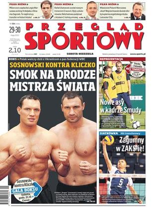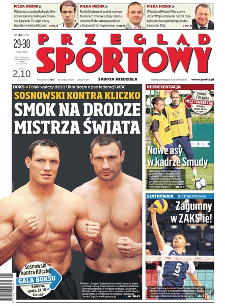Sosnowski kontra Kliczko: Polak walczy dziś z Ukraińcem o pas federacji WBC; nowe asy w kadrze Smudy: Adam Matuszczyk, Adrian Mierzejewski i Przemysław Tytoń zadebiutują w meczu z Finlandią; hit transferowy: Paweł Zagubny, rozgrywający reprezentacji Polski, będzie grał w ZAKS-ie Kędzierzyn-Koźle; Józef Wojciechowski, właściciel Polonii Warszawa, dostał ofertę kupienia angielskiego klubu Leicester City; Legia dokonała najdroższego transferu w swojej historii: za milion euro kupiła Ivicę Vrdoljaka z Dinama Zagrzeb; UEFA powierzyła Francji organizację kolejnego turnieju Euro; w Speedway Ekstralidze początek rundy rewanżowej, najciekawiej powinno być na torach w Toruniu i Bydgoszczy; dziś wieczorem w hali gdańskiej AWFiS odbędzie się impreza „Finałowy skok Blanika”; Robert Kubica chce walczyć z mercedesami w Grand Prix Turcji.