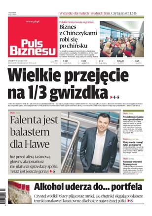 Biznes z Chińczykami robi się po chińsku; Vectra chce rządzić w Netii, ale – jak mówi prezes gdyńskiej kablówki – nie czuje się z tą inwestycją w pełni komfortowo, więc sięga tylko po 33 proc. akcji warte 600 mln zł.; Falenta jest balastem dla Hawe – już przed aferą taśmową główny akcjonariusz nie ułatwiał sprzedaży spółki, a teraz jest jeszcze gorzej; firmy łupkowe w wielkim napięciu czekają na wyniki najbardziej perspektywicznych wierceń na Pomorzu; ryzyko ukraińskie i niepokoje w Iraku przeszkadzają w aprecjacji polskiej waluty; Fundusz wskrzesi Transsystem; czystej wódki Polacy piją coraz mniej, ale chętniej sięgają po słabsze trunki smakowe i kosztowne alkohole z najwyższej półki.