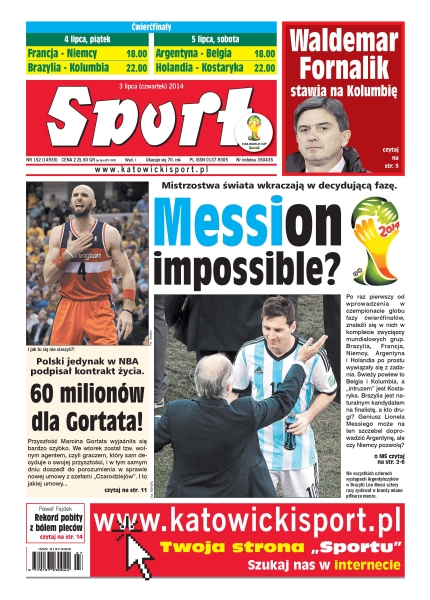 widowiskiem, na które patrzy się z najwyższą przyjemnością; Marcin Gortat zostaje w Washington Wizards – za pięć lat gry zarobi 60 mln dolarów; Waldemar Kawka, twórca sukcesów, po 25 latach pracy w zagłębiowskim mieście przenosi się do Bielska-Białej; uzyskując w słoweńskim Velenje 82,37 m Paweł Fajdek został liderem światowych tabel w rzucie młotem; grupa kilkudziesięciu zagranicznych kibiców, przybyłych na mundial, zjednoczyła siły na budowie centrum wychowaczo-sportowego dla dzieci.