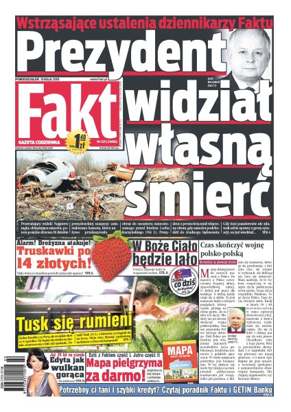 Wstrząsające ustalenia dziennikarzy Faktu: Lech Kaczyński był świadom tego, że za moment wydarzy się tragedia; minister rolnictwa Marek Sawicki ostrzega, że w tym sezonie cena truskawek może wynieść nawet 14 zł za kg; zobacz, jak wolny czas spędza premier Donald Tusk; masakra w Wólce Niedźwiedzkiej, sąsiedzi chcieli się pozabijać piłą łańcuchową; przez urzędników ofiary powodzi nie mają co jeść; Edyta Górniak 20 lat na scenie.