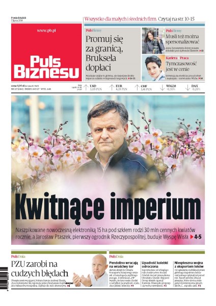 Fundusze unijne to główne, ale niejedyne źródło wsparcia udziału w imprezach targowych; Anna Karaszewska-Batory miesza składniki pod dyktando klientów; zrównują się stawki za pracę kobiet i mężczyzn — mówi Anna Wicha; naszpikowane nowoczesną elektroniką 15 ha pod szkłem rodzi 30 mln cennych kwiatów rocznie, a Jarosław Ptaszek, pierwszy ogrodnik Rzeczypospolitej, buduje Wyspę Wisła; PZU zarobi na cudzych błędach.
