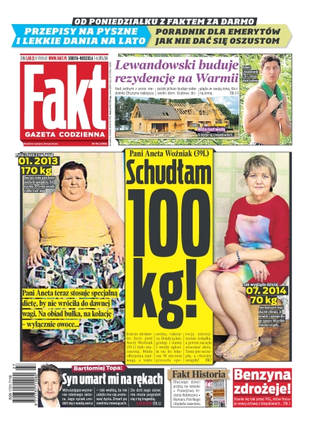 Lewandowski buduje rezydencję na Warmii; pani Aneta Woźniak schudła 100 kg; to z zapisków menedżera, który podsłuchiwał polityków, prokuratura wie, kto i gdzie został nagrany; przez ludowców zdrożeje paliwo; straż miejska chciała ukarać kierowcę, który nigdy w życiu nie miał ciężarówki; Dowbor jechał bez obowiązkowego światła odblaskowego – kara za to wynosi 100 zł; bliźniak żali się, że przez Annę Muchę jego bohater się nie rozwija, a to może sprawić, że znudzi się widzom; czy Polacy będą płacić mniej za węgiel; nabici we franki muszą sami sobie poradzić z kredytami; piłkarze Loewa w słabym stylu, ale awansowali do półfinału; Angel di Maria strzela najważniejsze gole; Dirk Kuyt to piłkarz o żelaznych płucach, a dodatkowo wyjątkowo wszechstronny; w meczu ostatniej szansy nasi siatkarze wyszarpali zwycięstwo z Iranem.