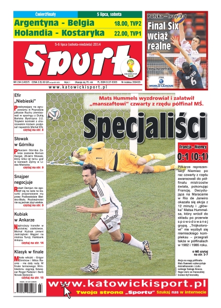 Niemcy czwarty raz z rzędu zagrają w półfinale MŚ – wygraną z Francją zapewnił im obrońca BVB; 28 lat temu Diego Maradona w pojedynkę ograł Belgów – teraz tego samego oczekuje się od człowieka, którego „Boski” osobiście namaścił na swojego następcę; fachowcy prorokowali, że po pokonaniu Urugwaju, Kostarykanie zostaną stłamszeni przez Włochów i Anglików; niedzielnymi zawodami w niemieckim Guestrow rozpocznie się rywalizacja o tytuł mistrza Europy – w cyklu wystąpią Tomasz Gollob, Patryk Dudek, Janusz Kołodziej i Adrian Miedziński; biało-czerwoni mają szansę na Final Six Ligi Światowej, ale pod warunkiem drugiej wygranej z Iranem i potknięcia Brazylii we Włoszech; w niedzielnym finale Roger Federer po raz 35. w karierze spotka się z Novakiem Djokoviciem; Nowy Jork, Las Vegas, Bałkany – to najczęściej wybierane miejsca na wakacje przez piłkarzy, którzy odpadli już z mistrzostw świata w Brazylii.