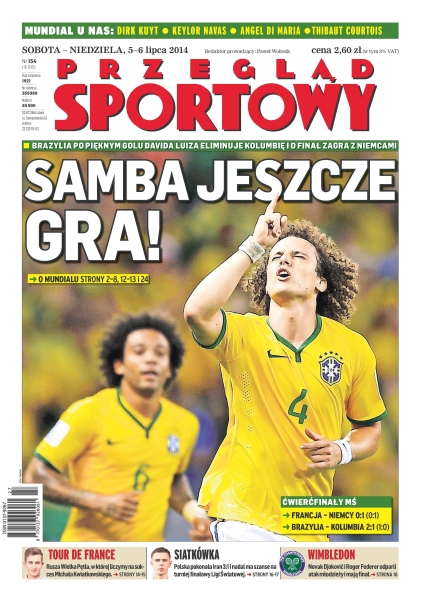 Czwarty kolejny półfinał ekipy zza Odry – Hummelsa wystarczył, aby awansować do półfinału mundialu; na Dirka Kuyta trener Louis van Gaal zawsze może liczyć; kraj odetchnął – Keylor Navas zagra z Holandią; Albicelestes niemal ćwierć wieku czekają na przebrnięcie przez ćwierćfinał mundialu; czy Thibaut Courtois znów powstrzyma genialnego Argentyńczyka; Brytyjczyk Chris Froome, Hiszpan Alberto Contador i Michał Kwiatkowski ruszają na trasę; biało-czerwoni pokonali Iran i nadal mają szansę na awans do Final Six; Roger Federer i Novak Djokovic zagrają w niedzielnym finale – w Londynie górę nad młodością wzięło doświadczenie; w słoweńskim Velenje Krisztian Pars zlekceważył Pawła Fajdka i został za to natychmiast ukarany; Lewis Hamilton wygrał treningi na Silverstone, ale miał awarię bolidu.