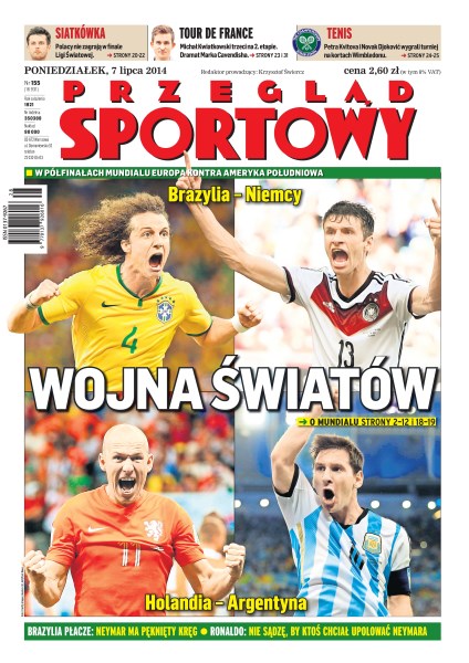 Kontuzja Neymara to tragedia narodowa – czy istnieje szczęśliwe zakończenie mundialu, skoro zabraknie gwiazdy; David Luiz musi zastąpić w roli przywódcy Neymara i Thiago Silvę; zmiana bramkarza tuż przed końcem dogrywki dała Pomarańczowym awans do półfinału; spełniam marzenia, gdzie indziej spotkałbym Neymara – mówi jeden z polskich wolontariuszy w Rio; Robert Lewandowski korzysta z ostatnich chwil urlopu, bo zaraz czeka go walka o miejsce w składzie w Bayernu.