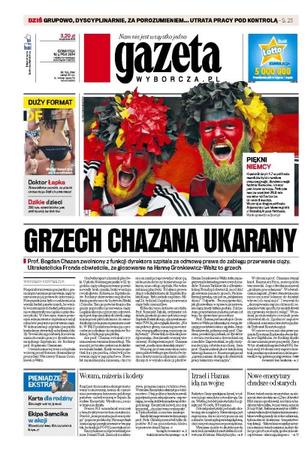 Prof. Bogdan Chazan zwolniony z funkcji dyrektora szpitala za odmowę prawa do zabiegu przerwania ciąży, ultrakatolicka Fronda obwieściła, że głosowanie na Hannę Gronkiewicz-Waltz to grzech; rząd jest doszczętnie skompromitowany – mówił w Sejmie Jarosław Kaczyński, co na to premier; wystrzeliwane ze Strefy Gazy prymitywne rakiety spadają na Izrael, w odwecie jego samoloty ostrzeliwują Gazę; Słowiańsk stoi w kolejce po chleb i wodę.