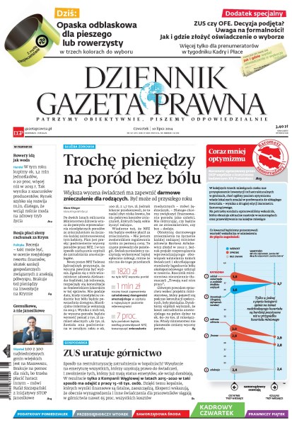 Trochę pieniędzy na poród bez bólu – większa wycena świadczeń ma zapewnić darmowe znieczulenie dla rodzących, być może od przyszłego roku; ZUS uratuje górnictwo; rowery idą jak woda – w tym roku kupimy ok. 1,2 mln jednośladów; Rosja płaci słony rachunek za Krym; gomułkowe, a nie Janosikowe.