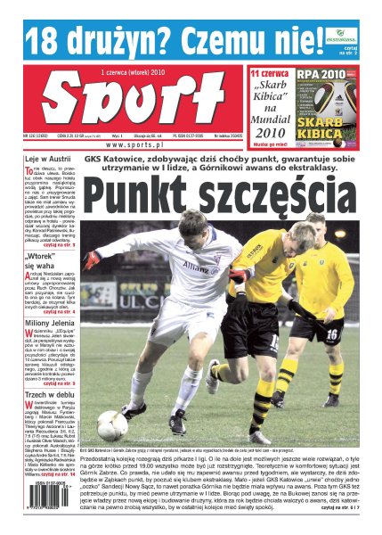 Jeżeli GKS zdobędzie dziś choćby jeden punkt, to zagwarantuje sobie utrzymanie w I lidze; jak wygląda plan obrad prezesów klubów ligowych; złe warunki pogodowe przeszkadzają naszej kadrze piłkarskiej realizować plany treningowe; zawodnicy Realu Madryt uzyskali pozwolenie na przedłużenie urlopów do 20 lipca; jaka przyszłość czeka Marcina Gortata w NBA; trzech polskich tenisistów w ćwierćfinale Roland Garros.