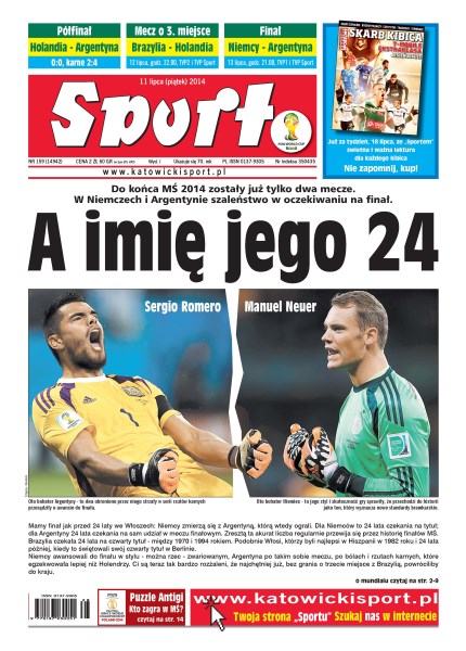 Do końca MŚ 2014 zostały już tylko dwa mecze, w Niemczech i Argentynie szaleństwo w oczekiwaniu na finał; 120 minut nie wystarczyło, by wyłonić drugiego finalistę, rzuty karne bezbłędnie wykonywali jednak tylko Argentyńczycy; przewodniczący Kolegium Sędziów PZPN, Zbigniew Przesmycki, uważa, że zawodnik powinien dostać czerwoną kartkę, gdy jego działanie naraża przeciwnika na kontuzję; 7 lipca zmarł wielki Alfredo di Stefano, tymczasem kilka tygodni temu minęło dokładnie 55 lat od jego wizyty na Stadionie Śląskim.