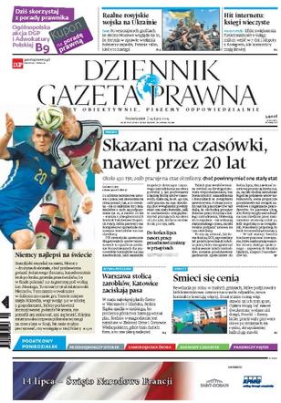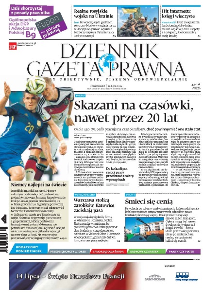 Skazani na czasówki, nawet przez 20 lat – Około 450 tysięcy osób pracuje na czas określony, choć powinny mieć one stały etat; realne rosyjskie wojska na Ukrainie – po wczorajszych groźbach ze strony Moskwy wygląda na to, że decyzja w sprawie wysłania żołnierzy zapadła – pytanie tylko, kiedy to nastąpi; hit internetu: księgi wieczyste – efekt zwiększenia funkcjonalności e-ksiąg: milion wejść w 7 dni i kłopoty z dostępem, ale komornicy mają łatwiej; Niemcy najlepsi na świecie – brazylijski mundial za nami, Niemcy, drużyna doskonała, choć pozbawiona gwiazd światowego formatu, konsekwentnie krok po kroku gromiła przeciwników, by w finale pokonać Argentynę 1:0; Warszawa stolicą zarobków, Katowice zaciskają pasa – w maju najwięcej płaciły firmy w Warszawie i Gdańsku, stolica Górnego Śląska spadła w rankingu, bo problemy górnictwa hamują wzrost płac.