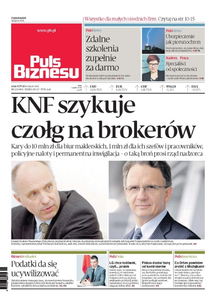 KNF szykuje czołg na brokerów – kary do 10 mln zł dla biur maklerskich, 1 mln zł dla ich szefów i pracowników, policyjne naloty i permanentna inwigilacja – o taką broń prosi rząd nadzorca; podatki da się ucywilizować – głębokie zmiany wymagają czasu, ale nawet prawna kosmetyka, przyprawiona szczyptą dobrej woli Mateusza Szczurka, ministra finansów, osłodziłaby życie polskim podatnikom; zdalne szkolenia zupełnie za darmo – w Akademii PARP na przedsiębiorców czeka 69 szkoleń z różnych dziedzin; ubezpieczenie jak piorunochron – warto sprawdzić, czy polisa firmy obejmuje szkody przepięciowe; fiskus dostał burę od kontrolerów – NIK po raz pierwszy zbadała, czy skarbówka przestrzega praw podatników, traktuje ich przyjaźnie i nie nadużywa siły, aparat podległy resortowi finansów ma z czego się tłumaczyć.