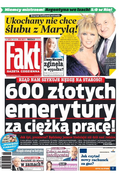 600 zł emerytury za ciężką pracę, rząd szykuje nam nędzę na starość – jak żyć, premierze – będziemy jeszcze biedniejsi niż dziś nasi rodzice; czy Iwona Wieczorek zginęła w wypadku – nowy trop w przeddzień 4. rocznicy zaginięcia dziewczyny; ksiądz utonął w Bałtyku – duchowny był uwielbiany przez wiernych; Polacy są mało inteligentni – przeczytaj kontrowersyjny wywiad z Januszem Korwinem-Mikke; Górniak przez rok kłamała na temat związku ze Schrammem; Jarosław Kaczyński nie wierzy w zamach – czyżby po czterech latach prezes zmienił zdanie; dramat królowej estrady – ukochany nie chce ślubu z Marylą.