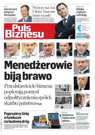Najwięksi przedstawiciele biznesu popierają pomysł odpolitycznienia spółek skarbu państwa; Ministerstwo Infrastruktury planuje pozyskać z Unii Europejskiej fundusze na budowę dróg w latach 2014-2020; Cyfrowy Polsat kusi darmowym internetem i rozmowami; firma Jerzego Staraka marzy o uskrzydleniu legendarnej marki; już dawno resort skarbu nie mógł przebierać w tak wielu ofertach zakupu spółki energetycznej; niemieccy inwestorzy zdecydowanie wolą Czechy niż Polskę.