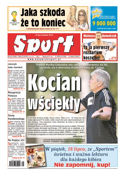 Kocian wściekły – trener Ruchu Chorzów nie ukrywa oburzenia na to, co stało się z murawą stadionu przy ul. Cichej; Janczyk lada moment – długo to trwało, ale Dawid Janczyk jest już blisko podpisania umowy z Piastem Gliwice, choć kibice nie zobaczyli go na przedsezonowej prezentacji i w trakcie niedzielnego sparingu z Żyliną; rezygnacja Pakosza – po siedmiu latach pełnienia funkcji prezesa AZS-u Częstochowa, Konrad Pakosz zrezygnował ze stanowiska, jego miejsce zajął Roman Lisowski, dotychczasowy wiceprezes; straty Kwiatkowskiego – Włoch Vincenzo Nibali wygrał 10. etap Tour de France, odzyskując po dniu przerwy żółtą koszulkę, Michał Kwiatkowski osłabł na ostatnim podjeździe i zajął 24. miejsce; na Księżyc ich – to najchętniej zrobiłby jeden z byłych działaczy hokejowych ze swoimi – do niedawna – kolegami po fachu, w skutek ich radosnej twórczości mocno zagrożone są rozgrywki ligowe.