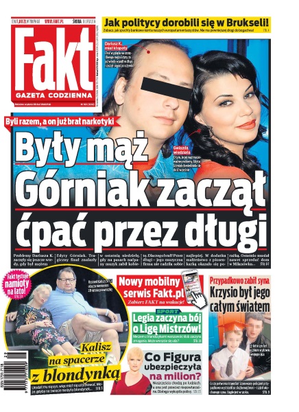 Były mąż Górniak zaczął ćpać przez długi – problemy Dariusza K. zaczęły się jeszcze wtedy, gdy był mężem Edyty Górniak, tragiczny finał znalazły w ostatnią niedzielę, gdy na pasach naćpany muzyk zabił kobietę – dlaczego brał? Przez długi – jego muzyczna firma nie radziła sobie najlepiej; jak politycy dorobili się w Brukseli – zobacz, jak spuchły bankowe konta naszych europarlamentarzystów, nie ma pewniejszej drogi do bogactwa; Krzysio był jego całym światem, przypadkowo zabił syna – szanowany policjant przypadkowo wystrzelił ze służbowej broni – i zabił ukochanego syna, ciągle jest w szoku; Kalisz na spacerze z blondynką – urodził mu się syn, więc miał się ustatkować, może, gdyby na świecie nie było blondynek; co Figura ubezpieczyła na milion – nieszczęścia chodzą po ludziach, a ona jest przecież niepowtarzalna, dlatego wykupiła polisę; Legia zaczyna bój o Ligę Mistrzów – meczem z Irlandczykami warszawski klub zaczyna zmagania, może wreszcie się uda.