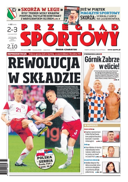 Polscy piłkarze dziś wieczorem zmierzą się z Serbią – w pierwszym składzie pojawi się pięciu nowych graczy; Górnik Zabrze po roku przerwy powraca na boiska ekstraklasy; Maciej Skorża podpisał z Legią trzyletnią umowę; o powiększeniu ligi lub podziale na grupy dyskutowały kluby i PZPN; Los Angeles Lakers i Boston Celtics pierwszym meczem finałowym rozpoczynają zmagania o mistrzostwo ligi NBA.