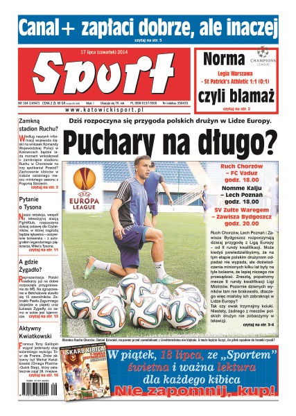Puchary, czy na długo – dziś rozpoczyna się przygoda polskich drużyn w Lidze Europy; czy zamkną stadion Ruchu – według naszych informacji wojewoda śląski na wniosek Komendy Wojewódzkiej Policji w Katowicach będzie lada moment wnioskował o zamknięcie stadionu Ruchu w Chorzowie na trzy spotkania; pytanie o Tysona – nasza redakcja, wespół z telewizyjną stacją FightKlub, rozpoczyna dzisiaj zabawę dla Czytelników, w której nagrodą będzie rękawica – oczywiście bokserska – z autografem legendarnego pięściarza, Mike’a Tysona; a gdzie Żygadło – reprezentacja Polski siatkarzy już na dobre rozpoczęła przygotowania do MŚ – na zgrupowanie w Bełchatowie stawiło się 15 zawodników, zabrakło Pawła Zagumnego oraz Łukasza Żygadły, co samo w sobie jest tajemnicze.