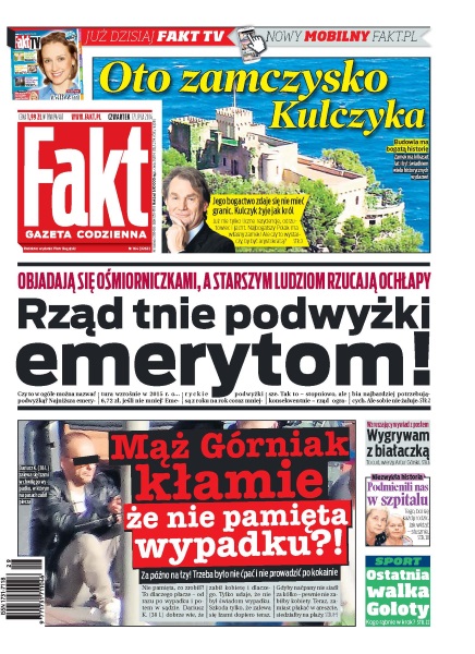 Rząd tnie podwyżki emerytom – objadają się ośmiorniczkami, a starszym ludziom rzucają ochłapy; mąż Górniak kłamie, że nie pamięta wypadku – za późno na łzy, trzeba było nie ćpać i nie prowadzić po kokainie; ostatnia walka Gołoty – kogo rąbnie w krok; podmienili nas w szpitalu – tego boi się każdy rodzic, jak widać słusznie; wygrywam z białaczką – wzruszający wywiad z posłem Arturem Górskim; zamczysko Kulczyka – jego bogactwo zdaje się nie mieć granic, Kulczyk żyje jak król – już nie tylko liczne rezydencje, odrzutowiec i jacht, najbogatszy Polak ma własny zamek, ale czy to wystarczy, by być arystokratą.