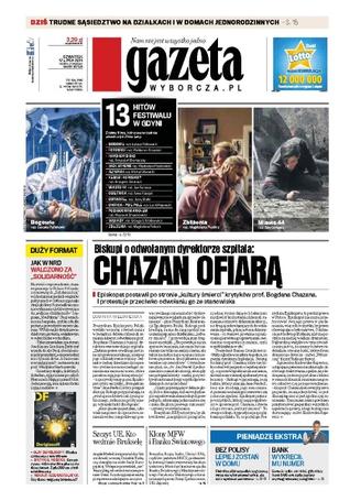 Biskupi o odwołanym dyrektorze szpitala: „Chazan ofiarą” – episkopat postawił po stronie „kultury śmierci” krytyków profesora Bogdana Chazana i protestuje przeciwko odwołaniu go ze stanowiska; szczyt UE, kto weźmie Brukselę – Angela Merkel i inni przywódcy Unii sondowali wczoraj Donalda Tuska, czy stanąłby na czele Rady Europejskiej, wstępnie powiedział „nie”; klony MFW i Banku Światowego – Brazylia, Rosja, Indie, Chiny i RPA, czyli tzw. państwa BRICS, postanowiły stworzyć bank i rezerwowy fundusz walutowy – ma to być konkurencja dla Banku Światowego i Międzynarodowego Funduszu Walutowego zdominowanych przez Stany Zjednoczone, UE i Japonię; bez polisy lepiej zostań w domu – choroba albo wypadek za granicą może nie tylko popsuć urlop, ale też zrujnować pechowca.