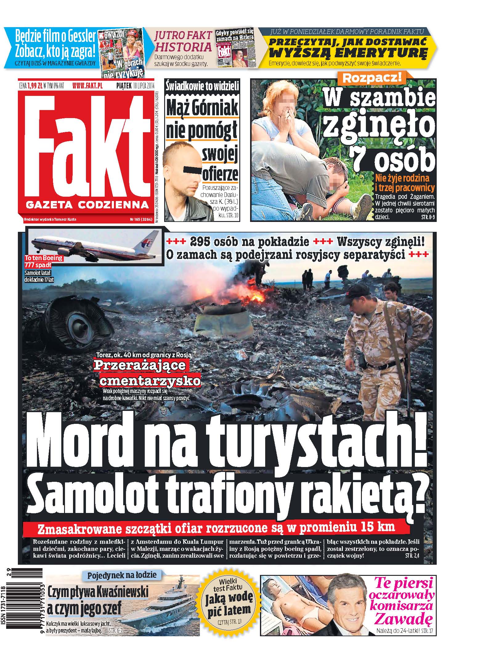 Mord na turystach, samolot trafiony rakietą – zmasakrowane szczątki ofiar rozrzucone są w promieniu 15km; w szambie zginęło 7 osób – nie żyje rodzina i trzej pracownicy – tragedia pod Żaganiem, w jednej chwili sierotami zostało pięcioro małych dzieci; mąż Górniak nie pomógł swojej ofierze – poruszające zachowanie Dariusza K. po wypadku; czym pływa Kwaśniewski, a czym jego szef – Kulczyk ma wielki luksusowy jacht, a były prezydent – małą łajbę; te piersi oczarowały komisarza Zawadę – należą do 24-latki.