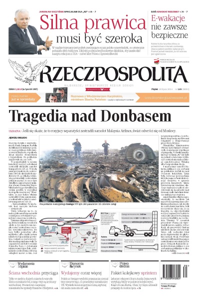 Tragedia nad Donbasem – jeśli się okaże, że to rosyjscy separatyści zestrzelili samolot Malaysia Airlines, świat odwróci się od Moskwy; silna prawica musi być szeroka – Jarosław Kaczyński specjalnie dla „Rz”; e-wakacje nie zawsze bezpieczne – rośnie liczba turystów, którzy za pośrednictwem internetu zestawiają własne pakiety podróży wakacyjnych – powinni jednak wiedzieć, że ich ochrona jest ograniczona; ściana wschodnia przyciąga – tylko w sześciu dużych miastach wzrosła liczba mieszkańców, z czego trzy są ze ściany wschodniej – procentowo najwięcej mieszkańców zyskały Rzeszów i Białystok; wydajemy coraz więcej – Polak na bieżące wydatki przeznacza niemal trzy czwarte tego, co przeciętny mieszkaniec UE, wydatki konsumpcyjne rosną szybciej niż nasza zamożność; pakiet kolejkowy sprintem – lekarze i eksperci Biura Analiz Sejmowych wytykają błędy w pakiecie kolejkowym – rząd ich nie słucha, chce, by Sejm uchwalił przepisy do końca lipca.